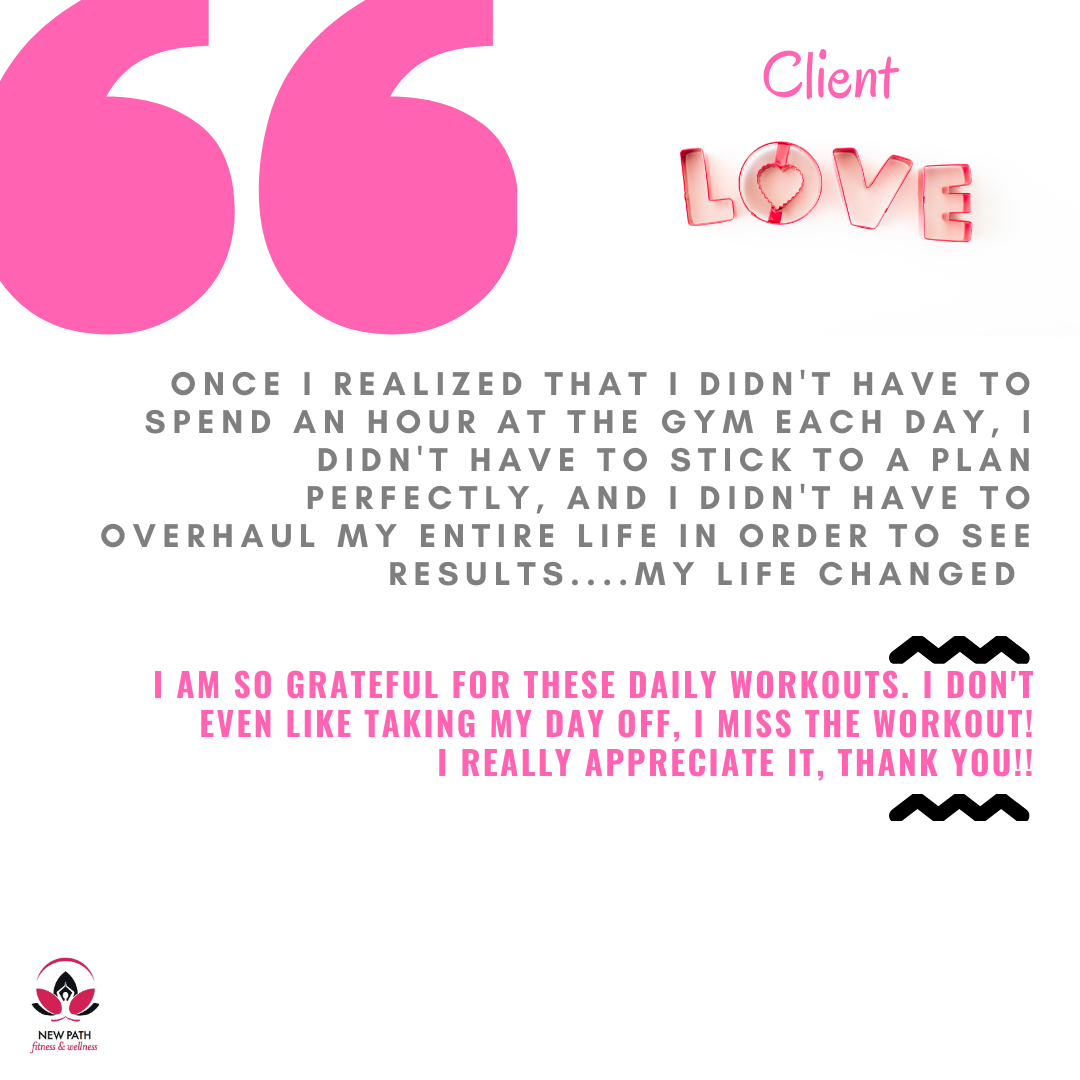 " I learned that shopping and planning ahead sets me up for success as far as meals are concerned, and that food prep is actually satisfying -I learned that taking all refined sugar and carbs out of my diet left me feeling energized, slimmer (no bloating) and just plain fantastic. I’ve lost 5.6lbs and am beginning to see my muscles respond to the weight training and HIIT. So much better for me than just plain running… I’m committed to continuing down this new path." - M.M. Ottawa